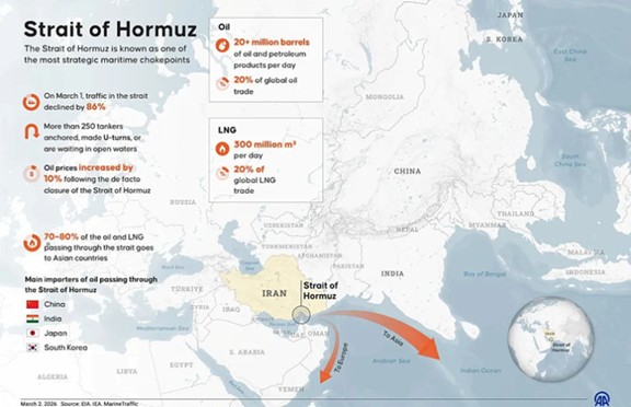 A key choke point is the Strait of Hormuz, through which a meaningful portion of global oil flows. Even brief disruption can move prices quickly.